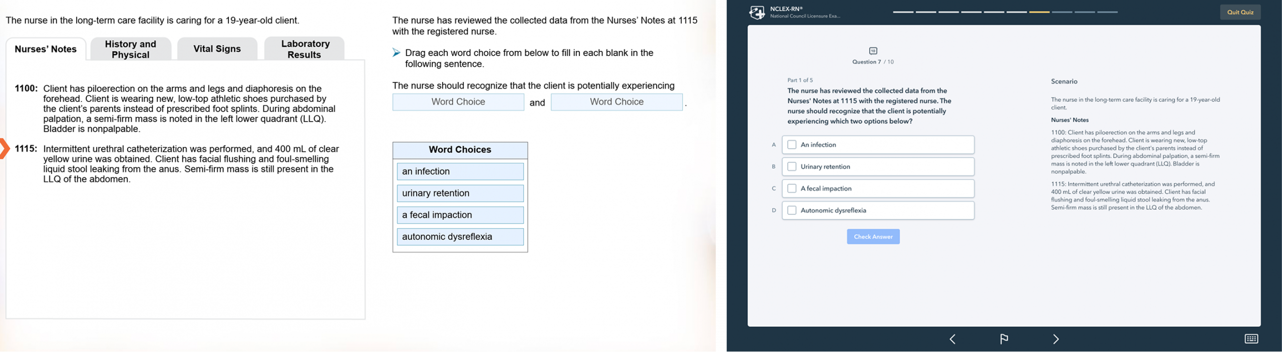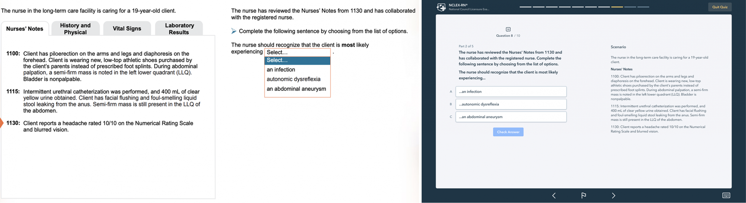 This item type evaluates the test taker’s ability to interpret information in context and apply clinical knowledge to select the best option for completing each part of the paragraph.